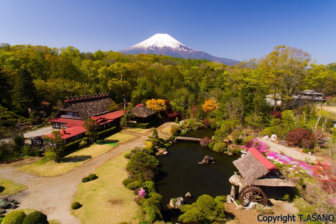 藁ぶき屋根、水車、新緑、富士山、しばし癒しの空間でボーっとしていました