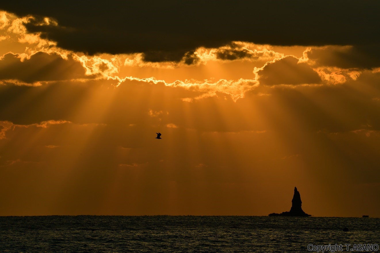 雲間から光のシャワーを浴びる立神岩