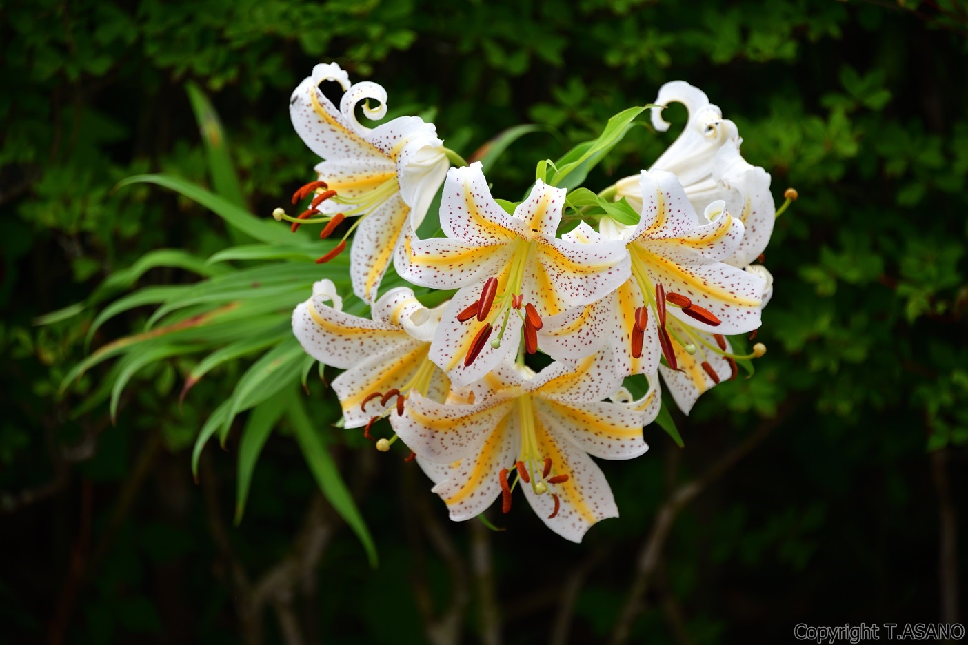 霧に包まれた高原にひときわ鮮やかに咲き誇るヤマゆりの花