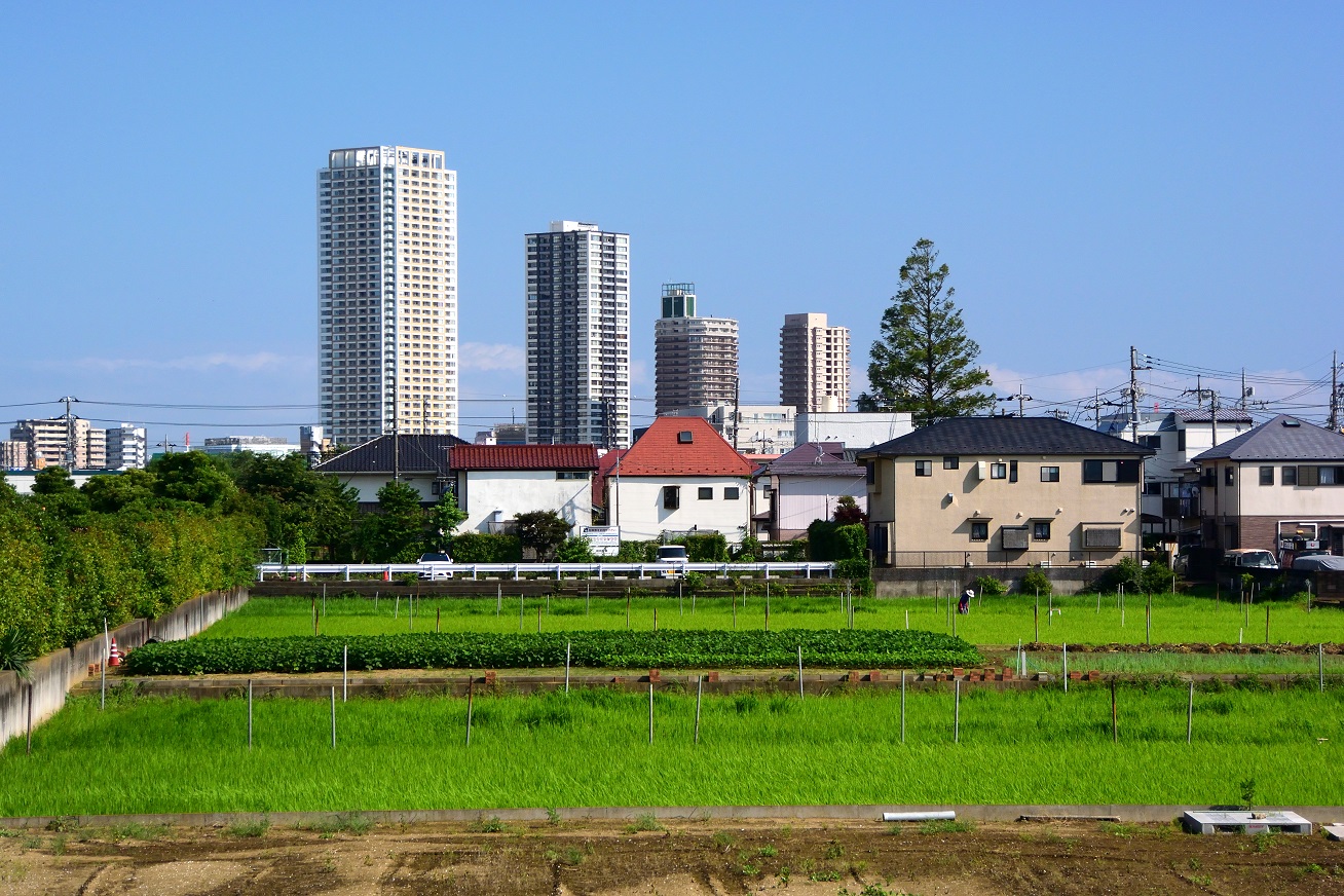 高層ビルに田んぼの緑がよく映える