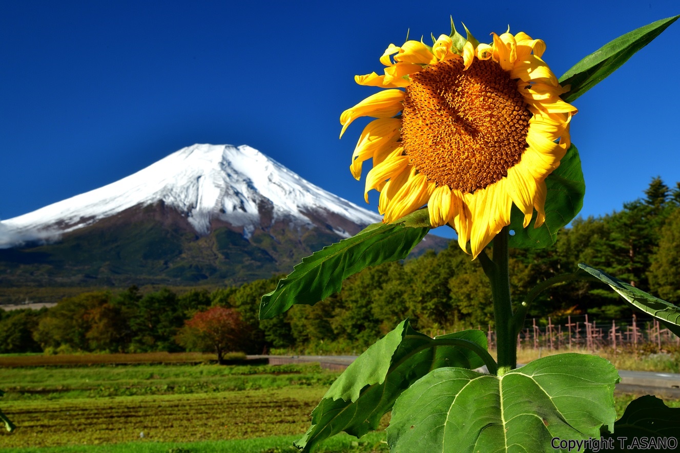 雪を抱いた富士山をヒマワリが笑顔でお出迎え